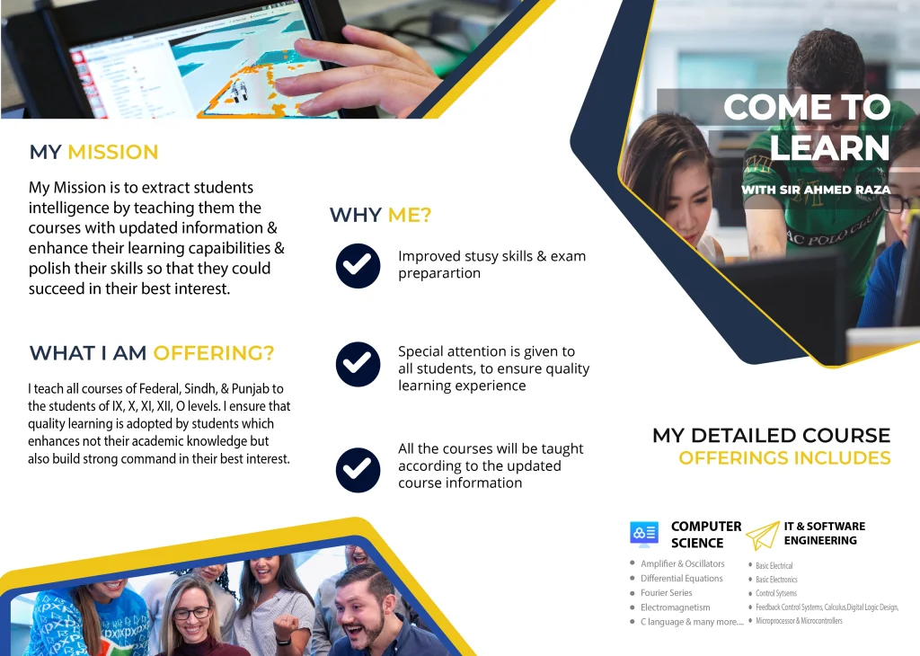 At The Ahmed Academy, we offer a comprehensive range of courses designed to meet the diverse learning needs of students. Our curriculum covers cutting-edge topics like IoT and hardware programming, along with university-level courses in subjects such as Digital Logic Design (DLD), mathematics, and calculus. In addition, we provide specialized crash courses for kids, as well as tailored programs for matriculation and intermediate students, helping them excel in their academic subjects. Whether you’re looking to enhance your technical skills or strengthen your foundational knowledge, The Ahmed Academy has the right course for you.